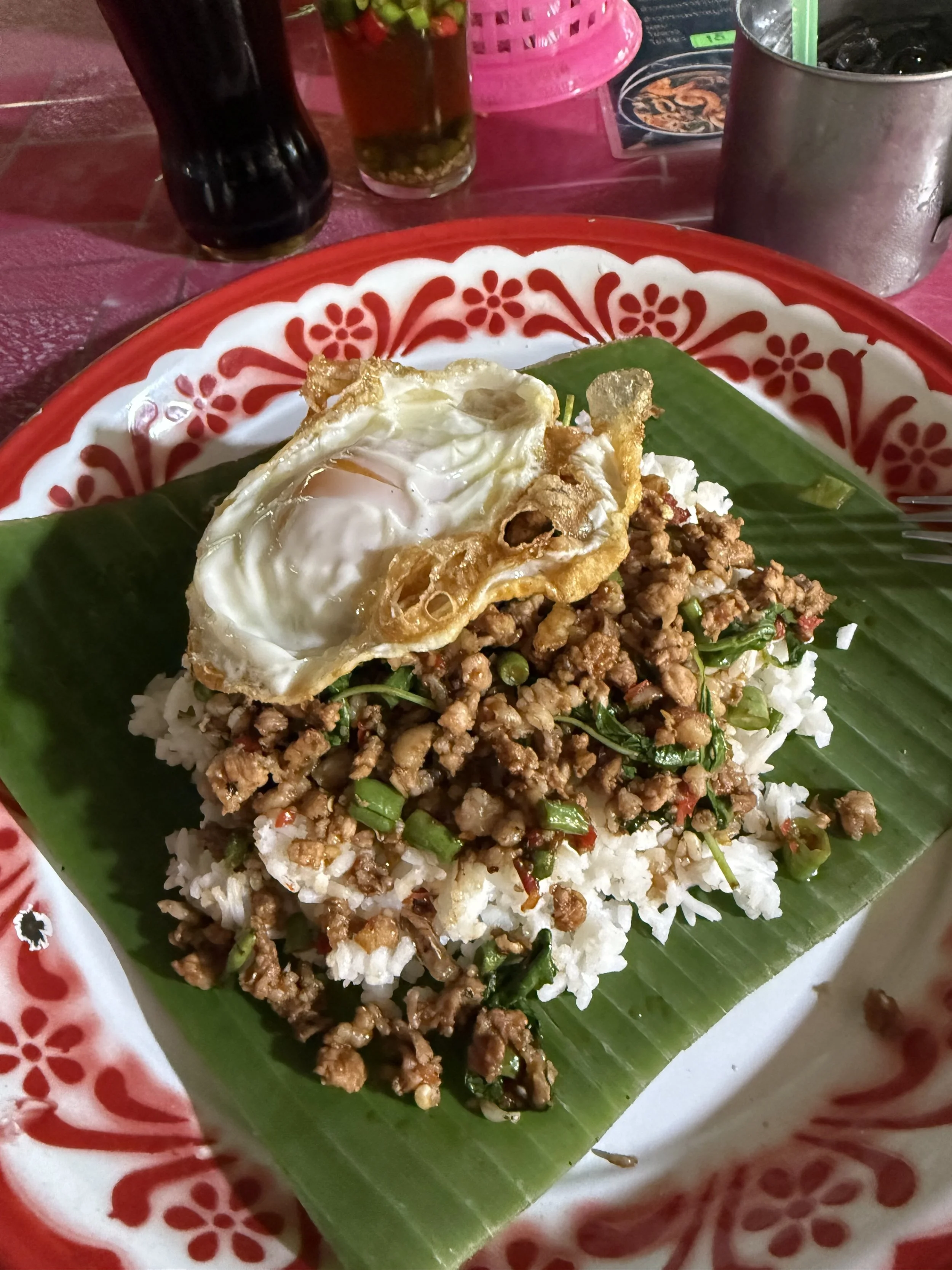 Pad Kraow Paow (Stir-fried with holy basil) with a fried egg on the top. This you can either order with pork, chicken or beef. I prefer pork, but none of the 3 will disappoint you, trust me.